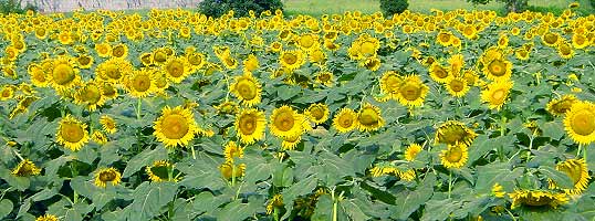 今年の夏はとんでもない暑さですが、暑いゆえに夏らしい風景が目を楽しませてくれます。写真は今朝、私の両親が近所に散歩に出かけて、そこで撮ってきた1枚です。ひまわり畑は、人の顔よりもデッカイ花でいっぱいだったそうです。まるでギラギラした太陽が、いっせいにこちらを向いているようですね(笑)。ちなみに、イギリスで仕事をしている同僚の便りによると、あちらはセーターが必要なほど冷夏とのこと。地球の気候はホントいろいろですね。 |