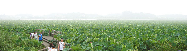 朝もやにつつまれた早朝、「手賀沼ハス群生地」まで観に行ってきました。写真のような広大なハスの群生ですが、もとは昭和20年代に水田で栽培していたハスの一部が沼に繁殖をはじめたものと言われています。かつて沼南町の観光地は、昨今流行(?)の市町村合併によって、柏市の観光地という位置づけになりました。ともあれ、豊かな自然の多い旧沼南町の観光地が身近になったことは嬉しい限りです。 |