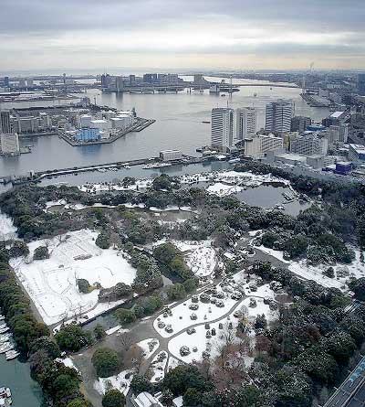 私は高いところが好きです。高いところからは色々なものが見えます。これも先週の大雪の翌日の話題ですが、汐留にある47階のレストランから東京湾が一望できました。しかもこの日はレインボーブリッジにお台場、そして雪の浜離宮という滅多にない写真を撮ることができました。今年は一段と寒い冬ではありますが、やはり出かけてみると楽しい風景に出会えますね♪ |