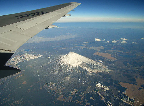 昨年末、台湾旅行に出かけた際に行きの飛行機から撮った富士山です。関東方面のお天気は良く、飛行機からの眺めは最高でした。写真右端に山中湖をはじめ、富士山の背後には富士五湖も写っています。飛行機の翼の下に見えるのは甲府盆地です。そして地平線に見える厚い雲の層。それは、年末年始に渡って新潟、北陸など日本海側に甚大な被害をもたらしている雪雲です。この風景を眺めていたときは、こんなにも多くの人命を奪うものとはまったく思ってませんでした。そこに暮らす方々のご苦労は、雪の少ない地域に住む私たちには想像を絶するものなのでしょう。被害が拡大しないことを願うばかりですね。 |