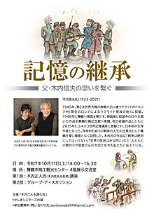 1945年、第2次世界大戦の敗戦で旧ソ連ウクライナのドネツク州(現在のロシアによるウクライナ侵攻の地)に抑留。1948年に舞鶴へ帰国を果たす。帰国後に抑留中の日々を描いた作品を舞鶴引揚記念館へ寄贈。他の収蔵作品とともに2015年にユネスコ世界記憶遺産に登録され、日本初の生存作家となった。存命中も自らの戦後の人生の出発点として舞鶴を愛し幾度となく訪問した。木内氏の作品は「戦争は絶対にしてはいけない」「世界の庶民はみな同じ」など、人と人との繋がりや慈愛の心の大切さを今も私たちに伝えている。(講演「記憶の継承」案内より)